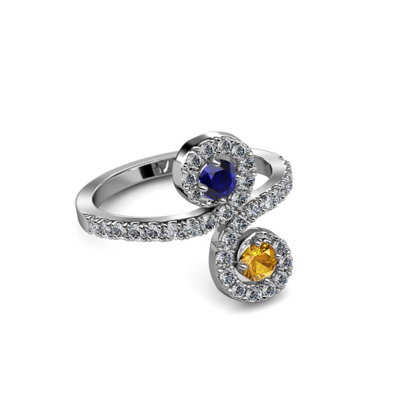Blue Sapphire and Citrine 2 Stone with Side Diamonds Bypass Engagement Ring 0.72 Carat tw in 14K White Gold. More Details ...