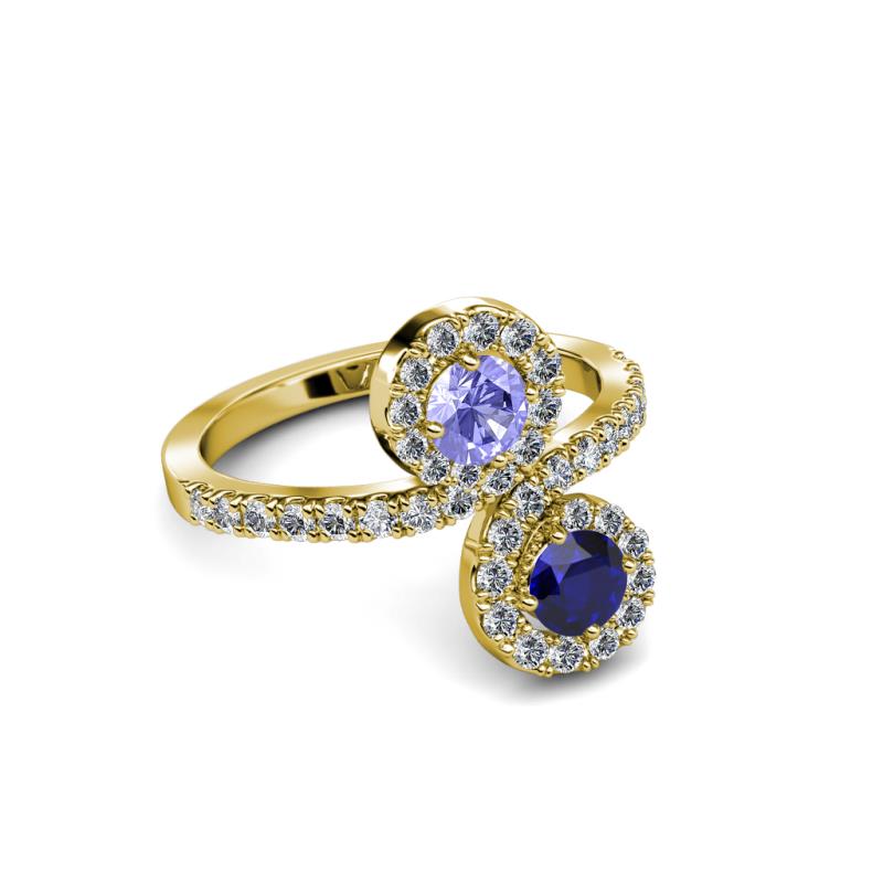 Blue Sapphire and Tanzanite 2 Stone with Side Diamonds Bypass Engagement Ring 1.39 Carat tw in 14K Yellow Gold. More Details ...