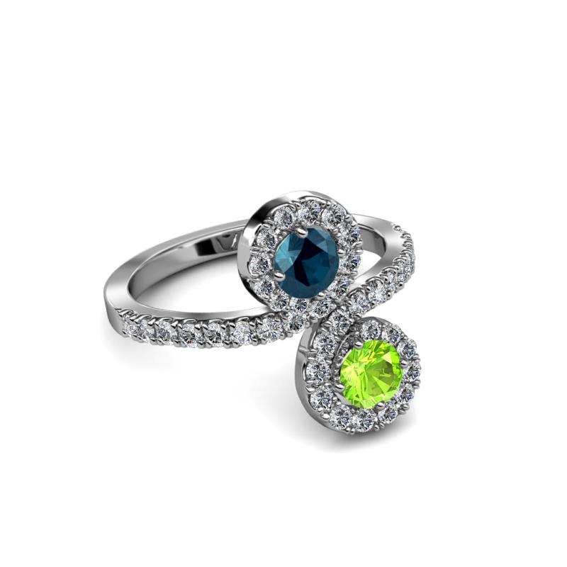A divine symbol of togetherness, where one stone represents love and one friendship while each end of the ring swirls around the marvelous combination of Peridot & Blue Diamond meeting above and below, rather than in the center.