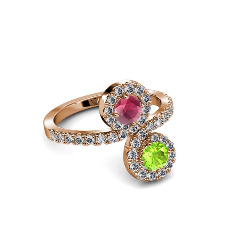 Peridot and Rhodolite Garnet 2 Stone with Side Diamonds Bypass Engagement Ring 1.30 Carat tw in 14K Rose Gold. More Details ...