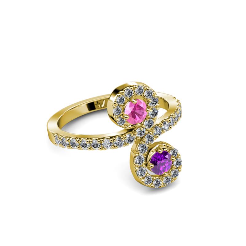 Pink Sapphire and Amethyst 2 Stone with Side Diamonds Bypass Engagement Ring 0.73 Carat tw in 14K Yellow Gold. More Details ...