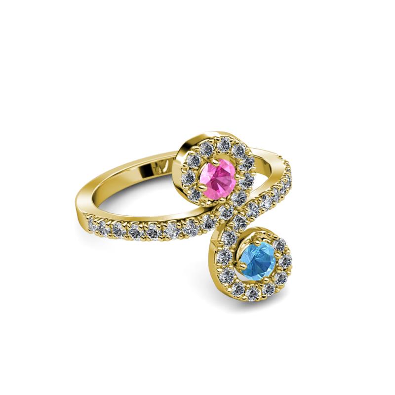 Pink Sapphire and Blue Topaz 2 Stone with Side Diamonds Bypass Engagement Ring 0.73 Carat tw in 14K Yellow Gold. More Details ...