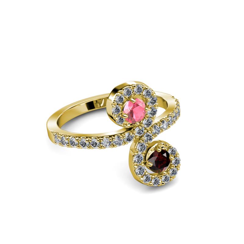 Pink Tourmaline and Red Garnet 2 Stone with Side Diamonds Bypass Engagement Ring 0.75 Carat tw in 14K Yellow Gold. More Details ...