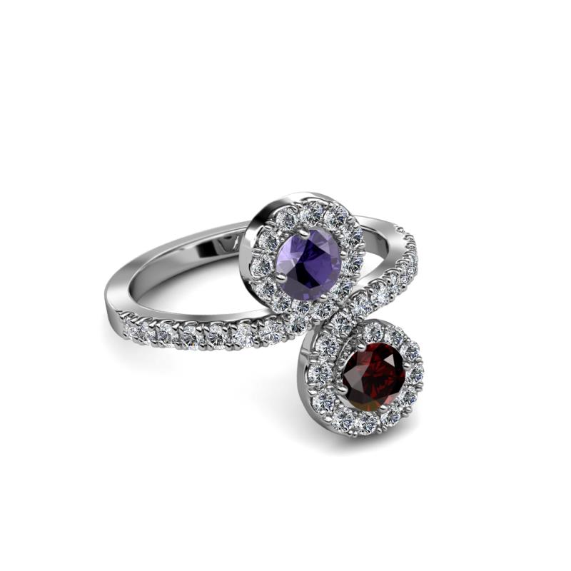A divine symbol of togetherness, where one stone represents love and one friendship while each end of the ring swirls around the marvelous combination of Red Garnet & Iolite meeting above and below, rather than in the center.