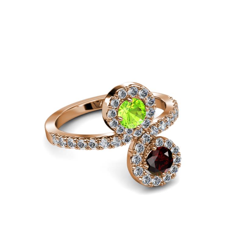 Red Garnet and Peridot 2 Stone with Side Diamonds Bypass Engagement Ring 1.30 Carat tw in 14K Rose Gold. More Details ...