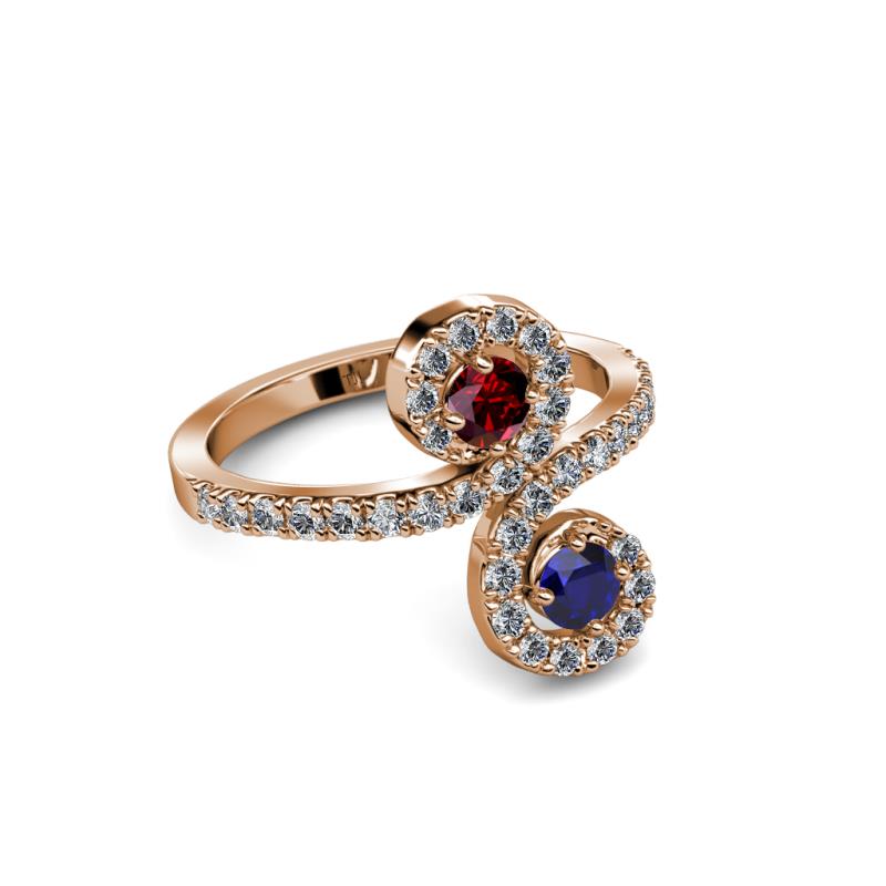 Ruby and Blue Sapphire 2 Stone with Side Diamonds Bypass Engagement Ring 0.74 Carat tw in 14K Rose Gold. More Details ...