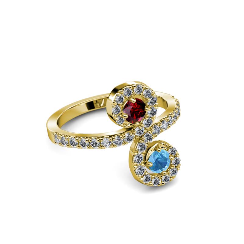 Ruby and Blue Topaz 2 Stone with Side Diamonds Bypass Engagement Ring 0.73 Carat tw in 14K Yellow Gold. More Details ...