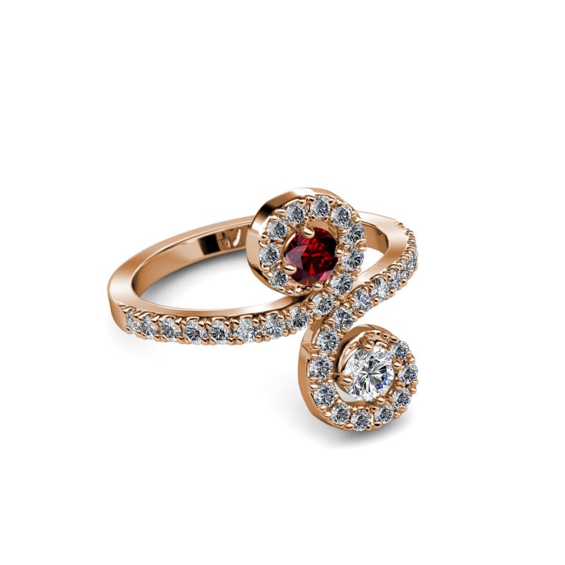 Ruby and Diamond 2 Stone with Side Diamonds Bypass Engagement Ring 0.74 Carat tw in 14K Rose Gold. More Details ...