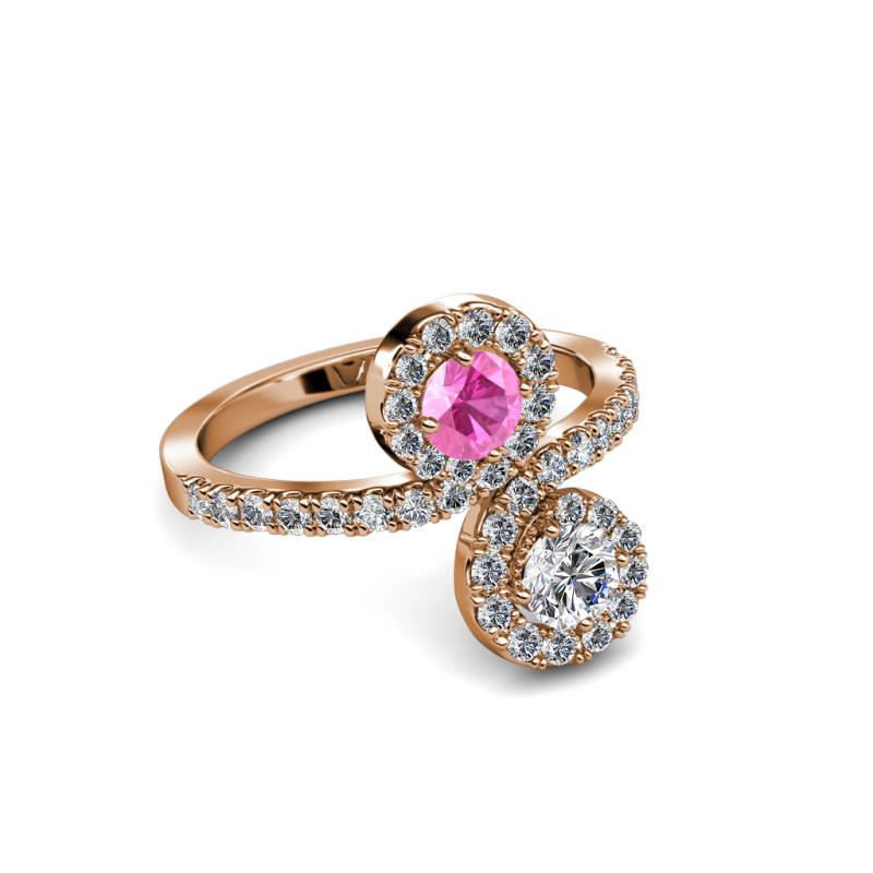 A divine symbol of togetherness, where one stone represents love and one friendship while each end of the ring swirls around the marvelous combination of Diamond & Pink Sapphire meeting above and below, rather than in the center.
