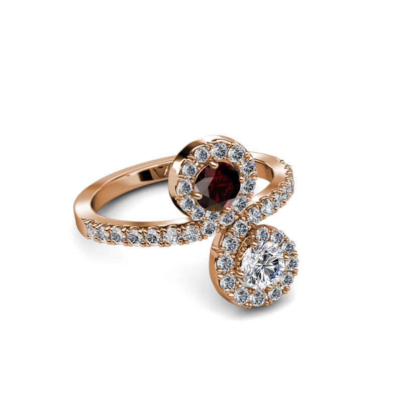 A divine symbol of togetherness, where one stone represents love and one friendship while each end of the ring swirls around the marvelous combination of Diamond & Red Garnet meeting above and below, rather than in the center.