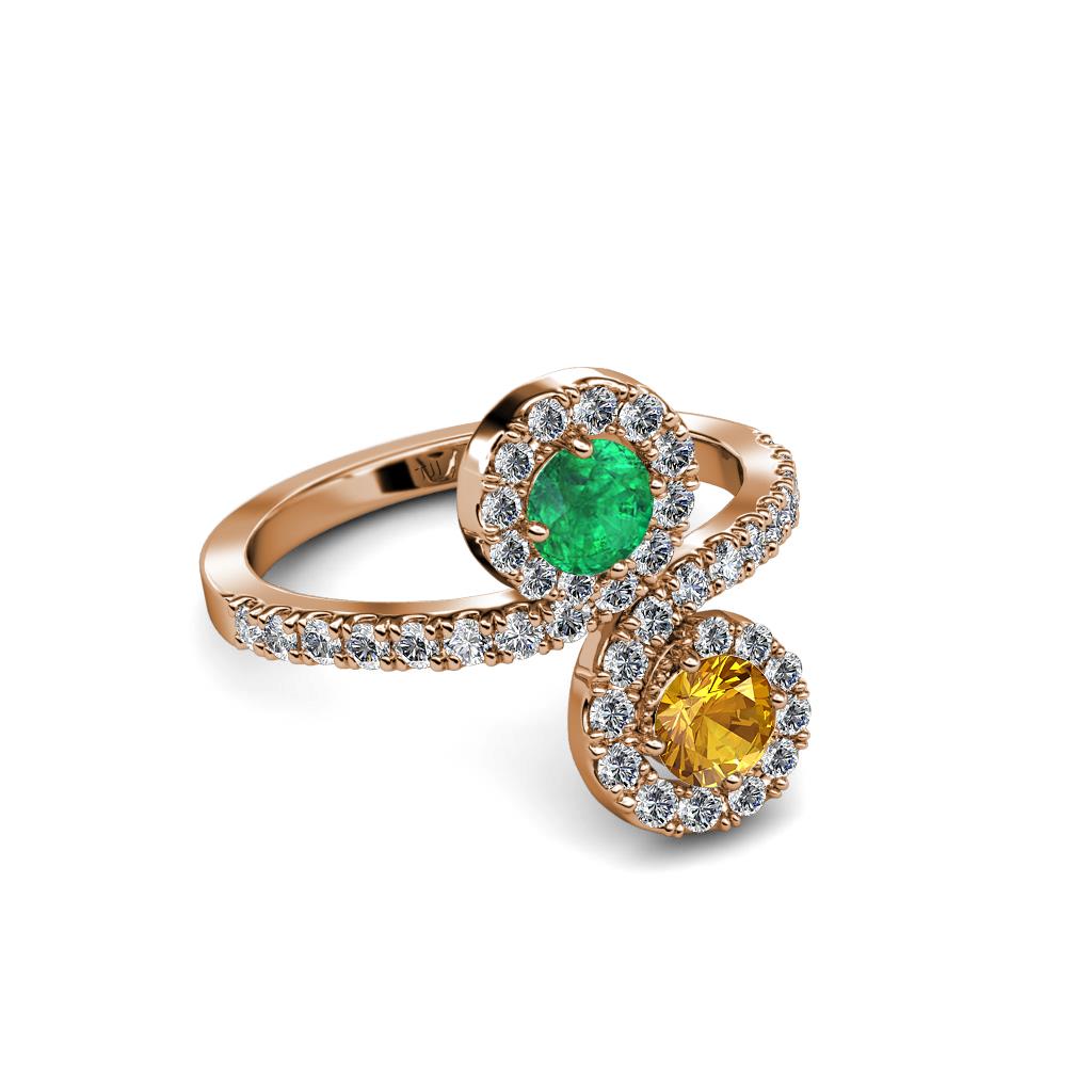A divine symbol of togetherness, where one stone represents love and one friendship while each end of the ring swirls around the marvelous combination of Citrine & Emerald meeting above and below, rather than in the center.
