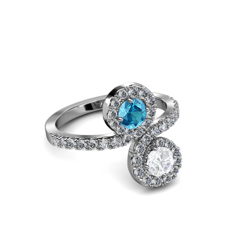 A divine symbol of togetherness, where one stone represents love and one friendship while each end of the ring swirls around the marvelous combination of White Sapphire & London Blue Topaz meeting above and below, rather than in the center.