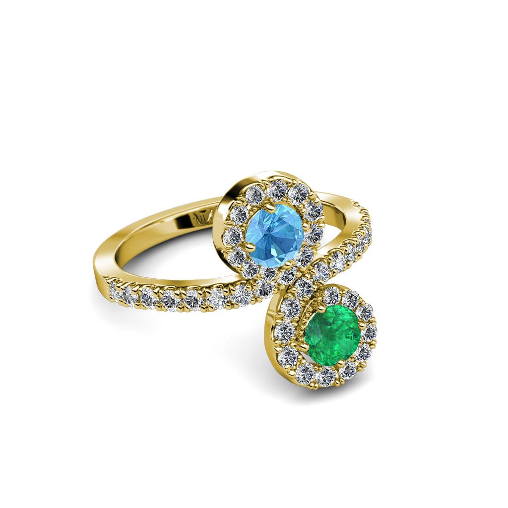 A divine symbol of togetherness, where one stone represents love and one friendship while each end of the ring swirls around the marvelous combination of Emerald & Blue Topaz meeting above and below, rather than in the center.