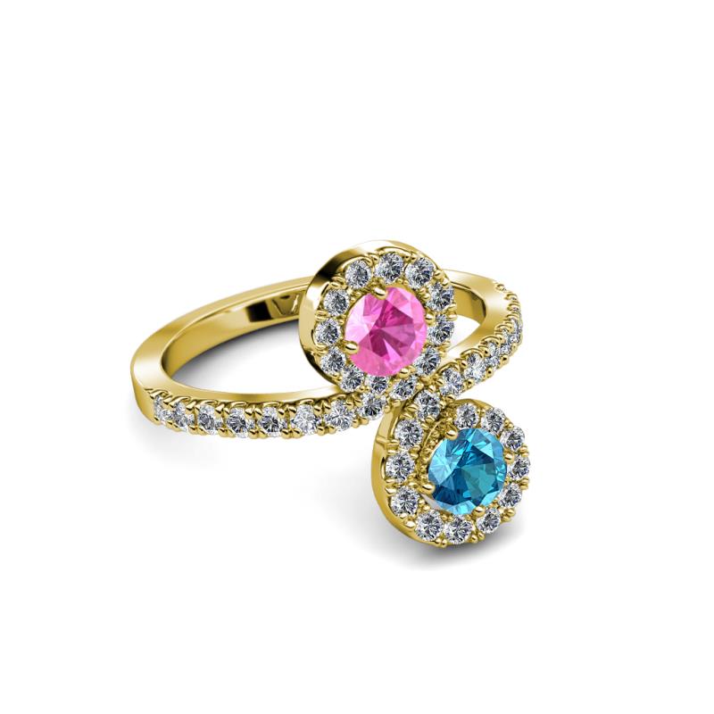 A divine symbol of togetherness, where one stone represents love and one friendship while each end of the ring swirls around the marvelous combination of London Blue Topaz & Pink Sapphire meeting above and below, rather than in the center.