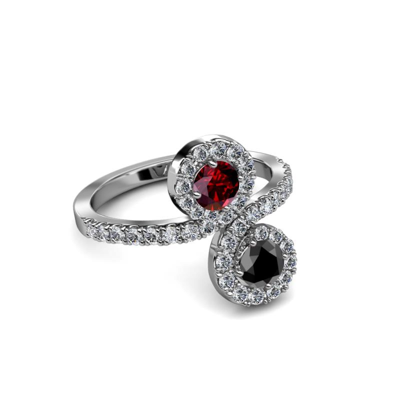 A divine symbol of togetherness, where one stone represents love and one friendship while each end of the ring swirls around the marvelous combination of Black Diamond & Ruby meeting above and below, rather than in the center.