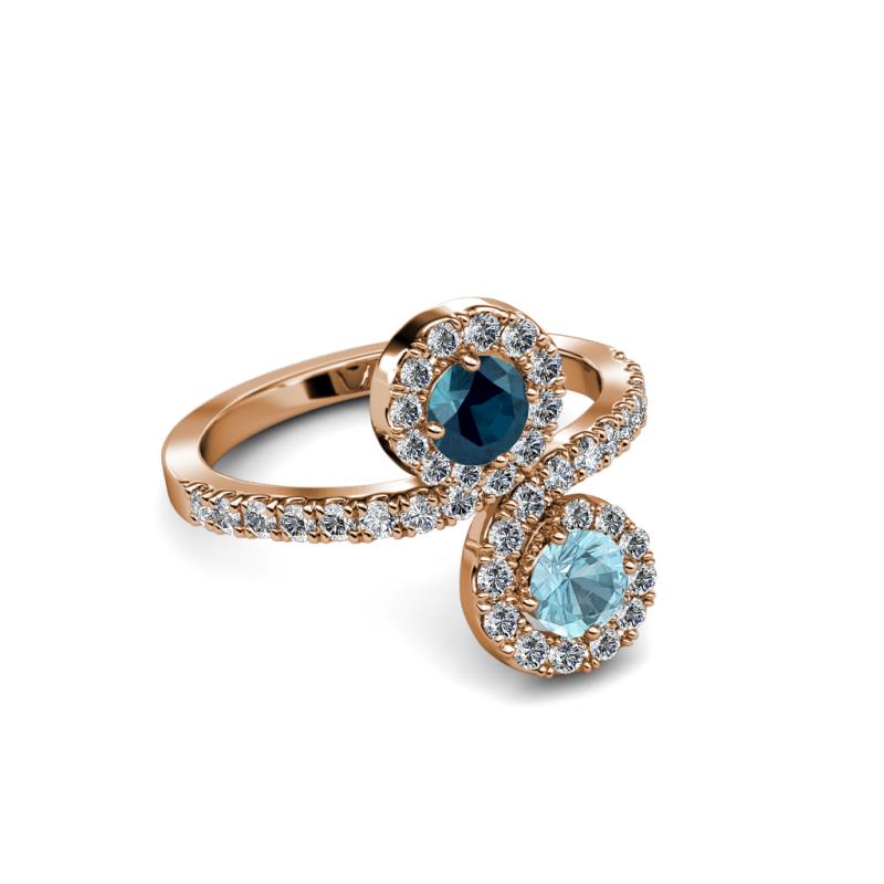A divine symbol of togetherness, where one stone represents love and one friendship while each end of the ring swirls around the marvelous combination of Aquamarine & Blue Diamond meeting above and below, rather than in the center.