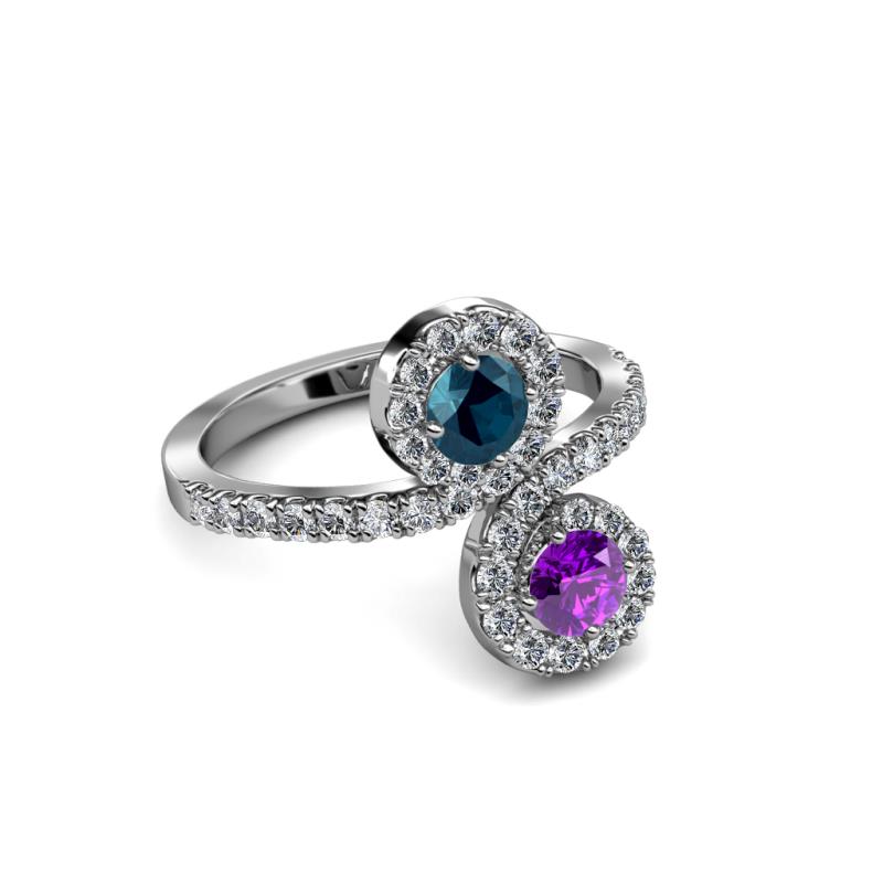 A divine symbol of togetherness, where one stone represents love and one friendship while each end of the ring swirls around the marvelous combination of Amethyst & Blue Diamond meeting above and below, rather than in the center.