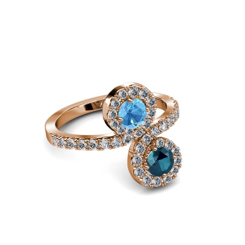 A divine symbol of togetherness, where one stone represents love and one friendship while each end of the ring swirls around the marvelous combination of Blue Diamond & Blue Topaz meeting above and below, rather than in the center.
