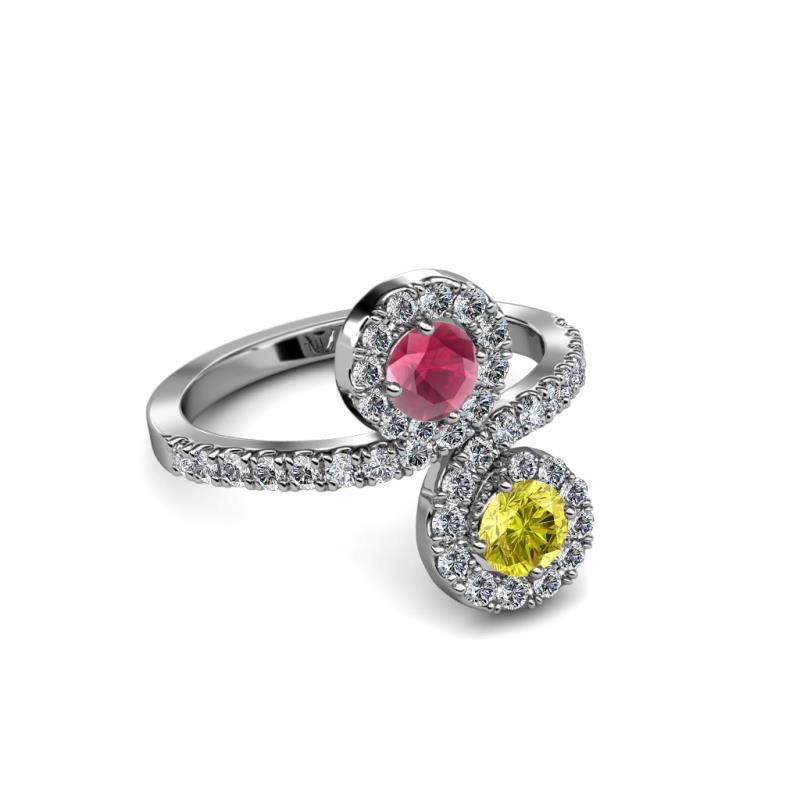 A divine symbol of togetherness, where one stone represents love and one friendship while each end of the ring swirls around the marvelous combination of Yellow Diamond & Rhodolite Garnet meeting above and below, rather than in the center.