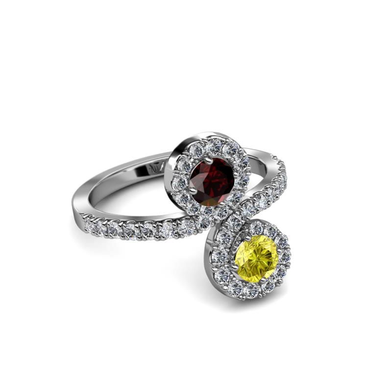A divine symbol of togetherness, where one stone represents love and one friendship while each end of the ring swirls around the marvelous combination of Yellow Diamond & Red Garnet meeting above and below, rather than in the center.