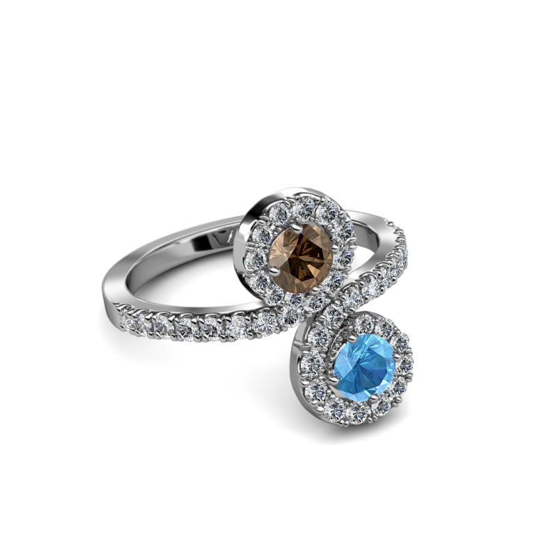 A divine symbol of togetherness, where one stone represents love and one friendship while each end of the ring swirls around the marvelous combination of Blue Topaz & Smoky Quartz meeting above and below, rather than in the center.