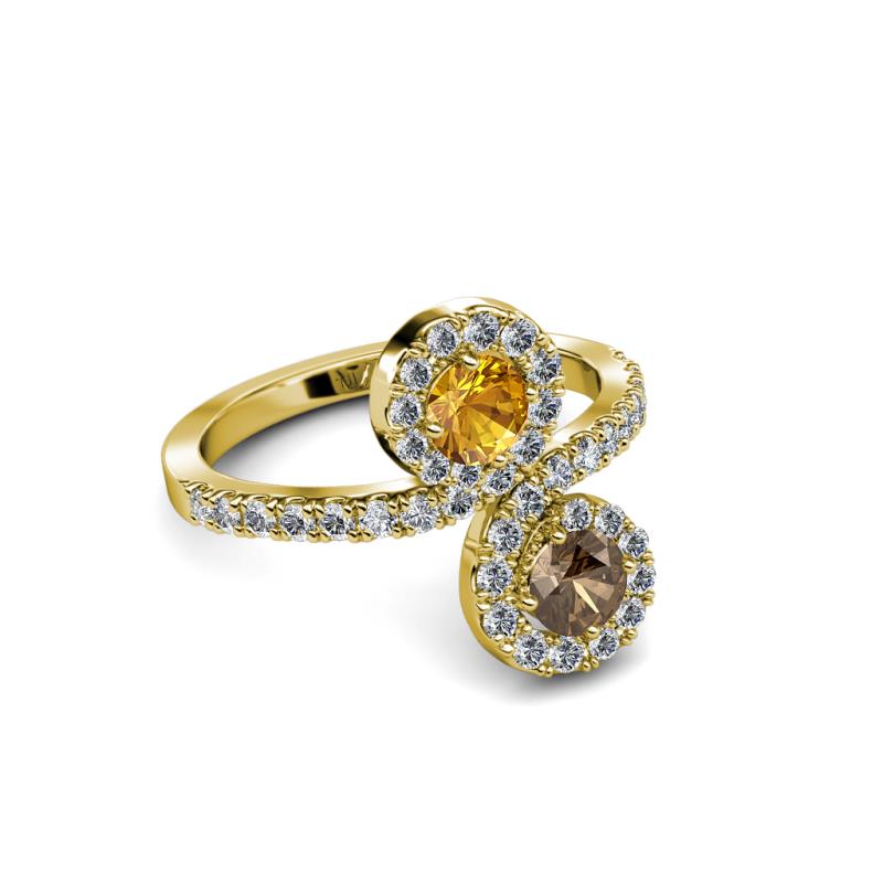 A divine symbol of togetherness, where one stone represents love and one friendship while each end of the ring swirls around the marvelous combination of Smoky Quartz & Citrine meeting above and below, rather than in the center.