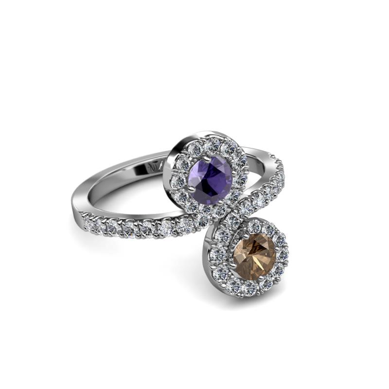 A divine symbol of togetherness, where one stone represents love and one friendship while each end of the ring swirls around the marvelous combination of Smoky Quartz & Iolite meeting above and below, rather than in the center.