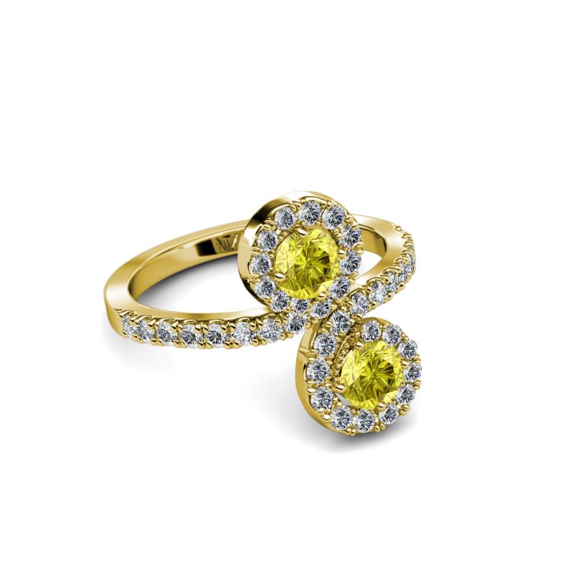 A divine symbol of togetherness, where one stone represents love and one friendship while each end of the ring swirls around the marvelous Yellow Diamond meeting above and below, rather than in the center.