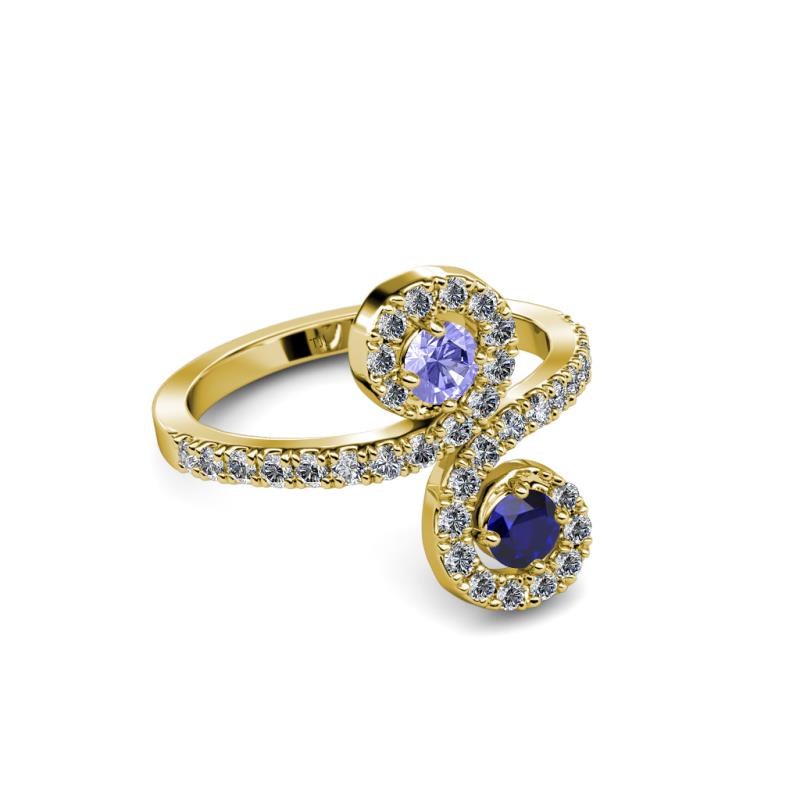 Tanzanite and Blue Sapphire 2 Stone with Side Diamonds Bypass Engagement Ring 0.73 Carat tw in 14K Yellow Gold. More Details ...