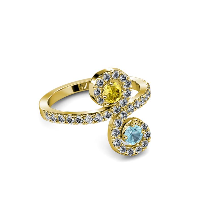 Yellow Sapphire and Aquamarine 2 Stone with Side Diamonds Bypass Engagement Ring 0.73 Carat tw in 14K Yellow Gold. More Details ...