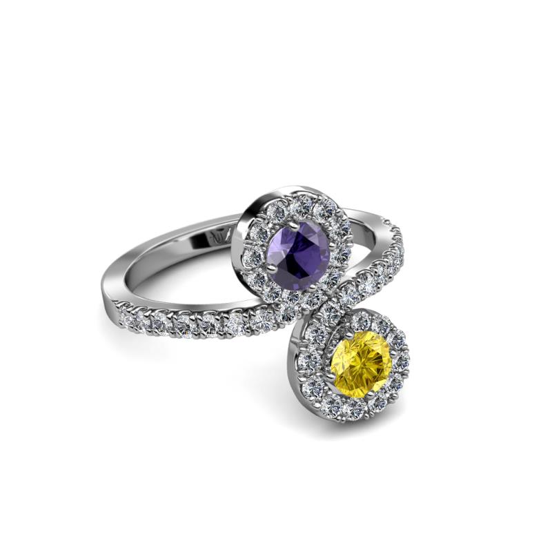 Yellow Sapphire and Iolite 2 Stone with Side Diamonds Bypass Engagement Ring 1.24 Carat tw in 14K White Gold. More Details ...