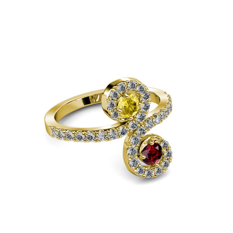 Yellow Sapphire and Ruby 2 Stone with Side Diamonds Bypass Engagement Ring 0.75 Carat tw in 14K Yellow Gold. More Details ...