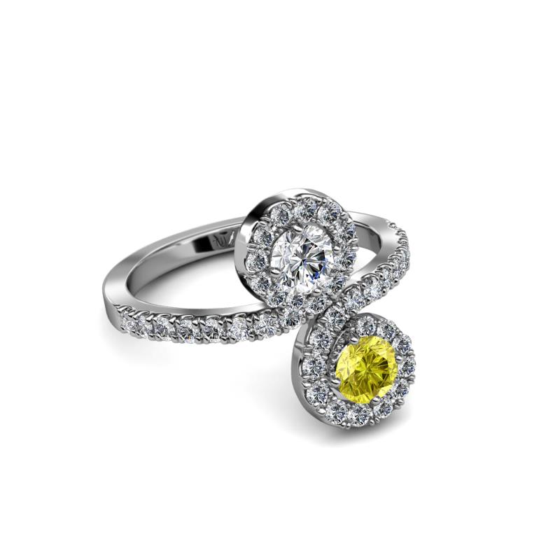 A divine symbol of togetherness, where one stone represents love and one friendship while each end of the ring swirls around the marvelous combination of Yellow Diamond & Diamond meeting above and below, rather than in the center.