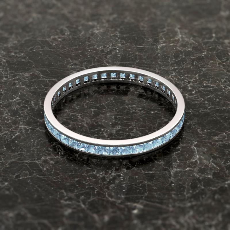 Shining with opulence and femine appeal, this Eternity Band inspires any attire with Glittering Princess Cut Channel Set Aquamarine symbolizing the Eternal Circle of Love. *As per ring size the stone and carat total weight changes.