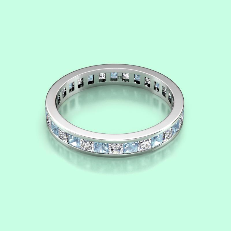 Shining with opulence and femine appeal, this Eternity Band inspires any attire with Glittering Princess Cut Channel Set Aquamarine and Lab Grown Diamond symbolizing the Eternal Circle of Love. *As per ring size the stone and carat total weight changes.