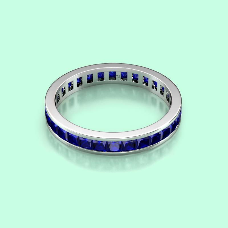 Shining with opulence and femine appeal, this Eternity Band inspires any attire with Glittering Princess Cut Channel Set Blue Sapphire symbolizing the Eternal Circle of Love. *As per ring size the stone and carat total weight changes.