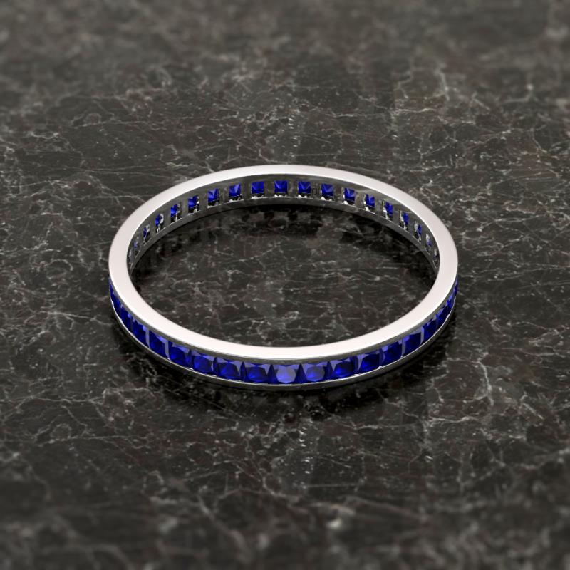 Shining with opulence and femine appeal, this Eternity Band inspires any attire with Glittering Princess Cut Channel Set Blue Sapphire symbolizing the Eternal Circle of Love. *As per ring size the stone and carat total weight changes.