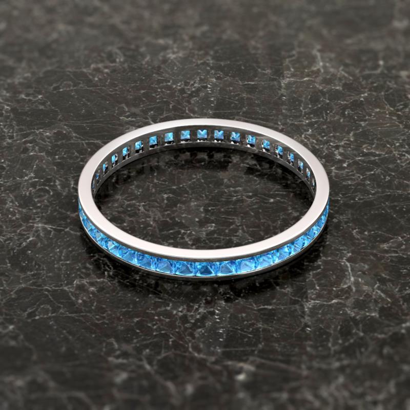 Shining with opulence and femine appeal, this Eternity Band inspires any attire with Glittering Princess Cut Channel Set Blue Topaz symbolizing the Eternal Circle of Love. *As per ring size the stone and carat total weight changes.