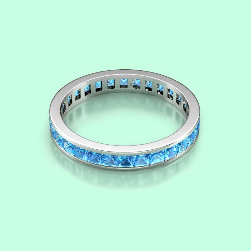 Shining with opulence and femine appeal, this Eternity Band inspires any attire with Glittering Princess Cut Channel Set Blue Topaz symbolizing the Eternal Circle of Love. *As per ring size the stone and carat total weight changes.