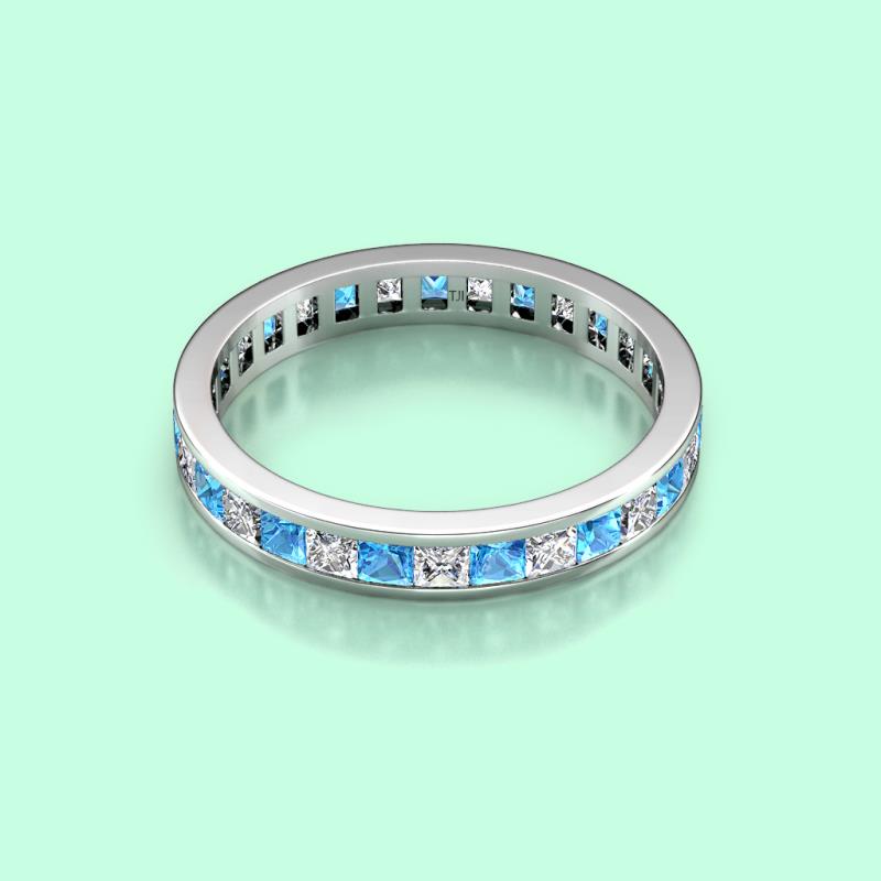 Shining with opulence and femine appeal, this Eternity Band inspires any attire with Glittering Princess Cut Channel Set Blue Topaz and Diamond symbolizing the Eternal Circle of Love. *As per ring size the stone and carat total weight changes.