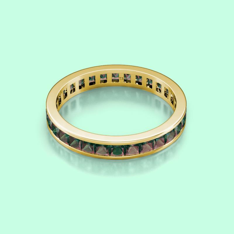 Shining with opulence and femine appeal, this Eternity Band inspires any attire with Glittering Princess Cut Channel Set Created Alexandrite symbolizing the Eternal Circle of Love. *As per ring size the stone and carat total weight changes.