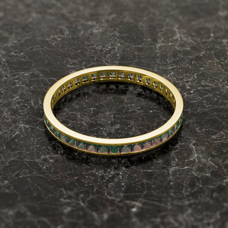 Shining with opulence and femine appeal, this Eternity Band inspires any attire with Glittering Princess Cut Channel Set Created Alexandrite symbolizing the Eternal Circle of Love. *As per ring size the stone and carat total weight changes.