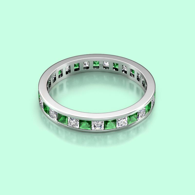 Shining with opulence and femine appeal, this Eternity Band inspires any attire with Glittering Princess Cut Channel Set Green Garnet and Lab Grown Diamond symbolizing the Eternal Circle of Love. *As per ring size the stone and carat total weight changes.