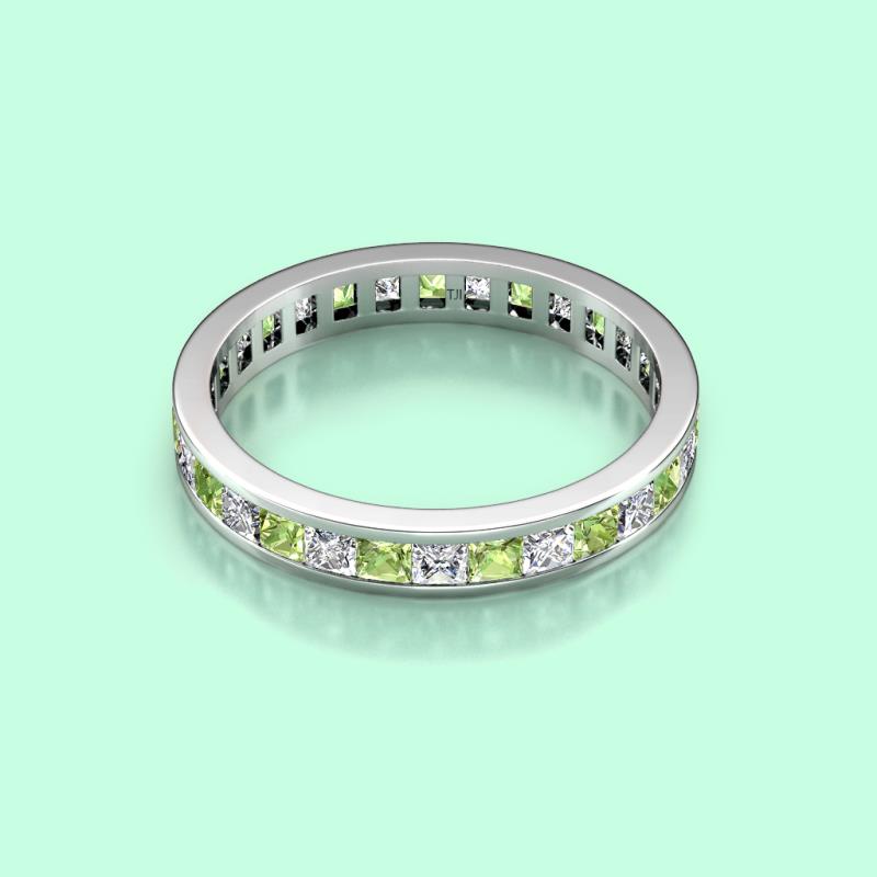 Shining with opulence and femine appeal, this Eternity Band inspires any attire with Glittering Princess Cut Channel Set Peridot and Diamond symbolizing the Eternal Circle of Love. *As per ring size the stone and carat total weight changes.