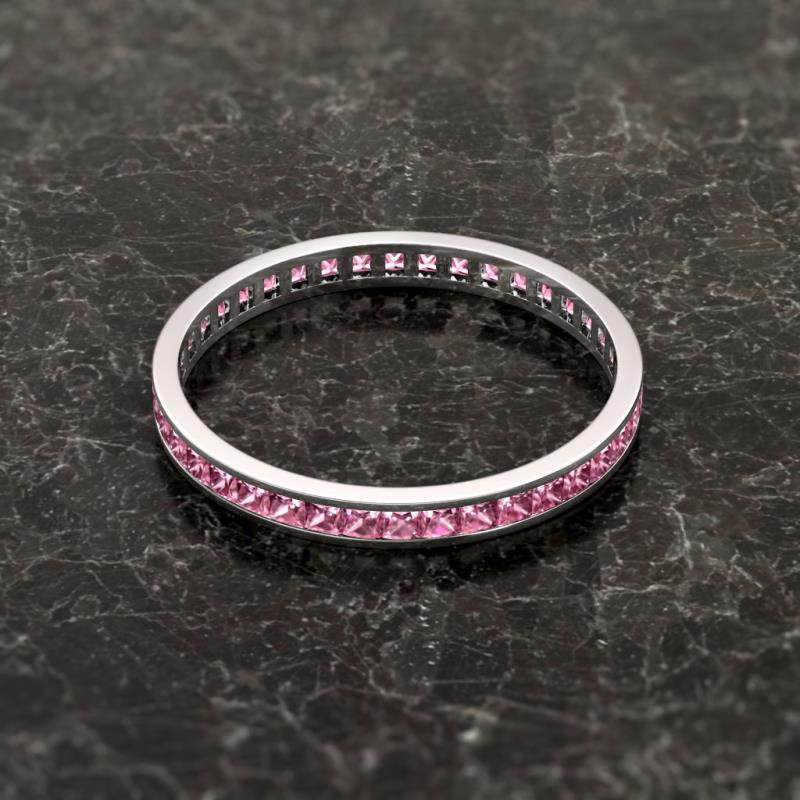 Shining with opulence and femine appeal, this Eternity Band inspires any attire with Glittering Princess Cut Channel Set Pink Tourmaline symbolizing the Eternal Circle of Love. *As per ring size the stone and carat total weight changes.