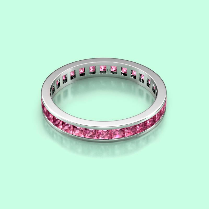 Shining with opulence and femine appeal, this Eternity Band inspires any attire with Glittering Princess Cut Channel Set Pink Tourmaline symbolizing the Eternal Circle of Love. *As per ring size the stone and carat total weight changes.