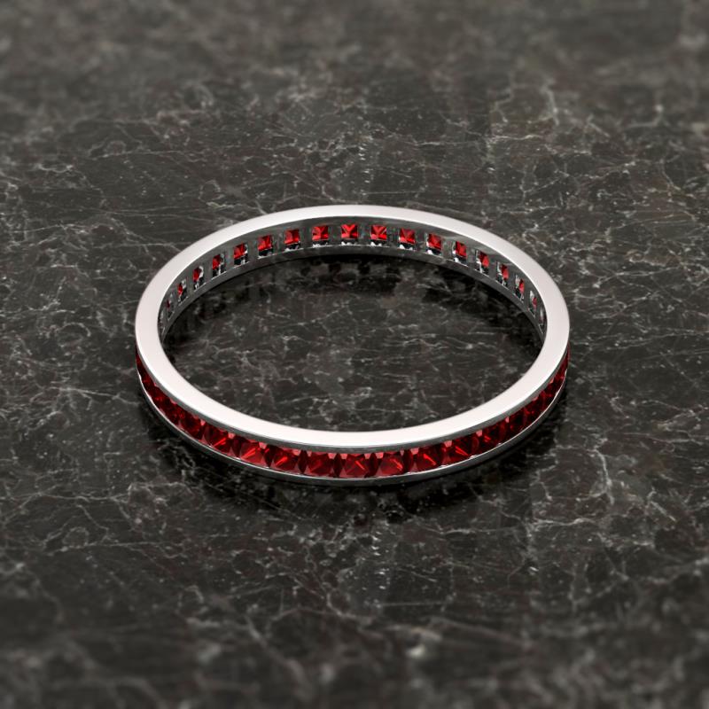 Shining with opulence and femine appeal, this Eternity Band inspires any attire with Glittering Princess Cut Channel Set Red Garnet symbolizing the Eternal Circle of Love. *As per ring size the stone and carat total weight changes.