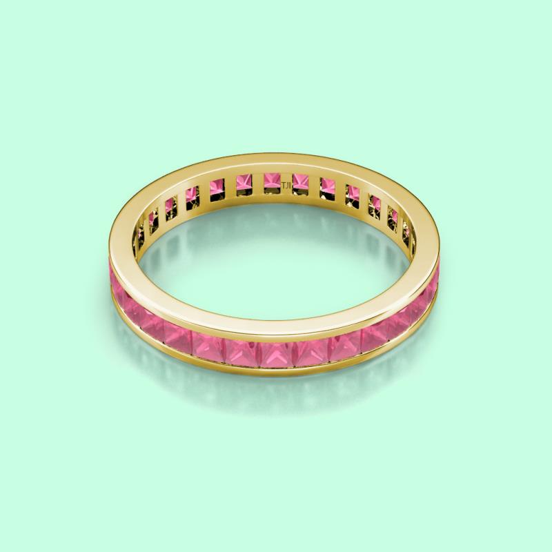Shining with opulence and femine appeal, this Eternity Band inspires any attire with Glittering Princess Cut Channel Set Rhodolite Garnet symbolizing the Eternal Circle of Love. *As per ring size the stone and carat total weight changes.