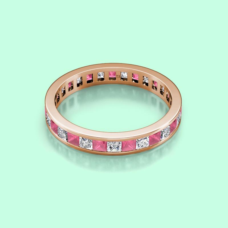 Shining with opulence and femine appeal, this Eternity Band inspires any attire with Glittering Princess Cut Channel Set Rhodolite Garnet and Diamond symbolizing the Eternal Circle of Love. *As per ring size the stone and carat total weight changes.