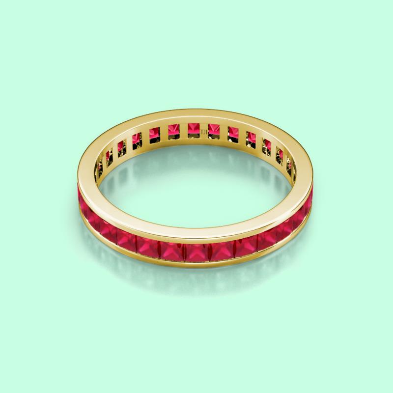 Shining with opulence and femine appeal, this Eternity Band inspires any attire with Glittering Princess Cut Channel Set Ruby symbolizing the Eternal Circle of Love. *As per ring size the stone and carat total weight changes.
